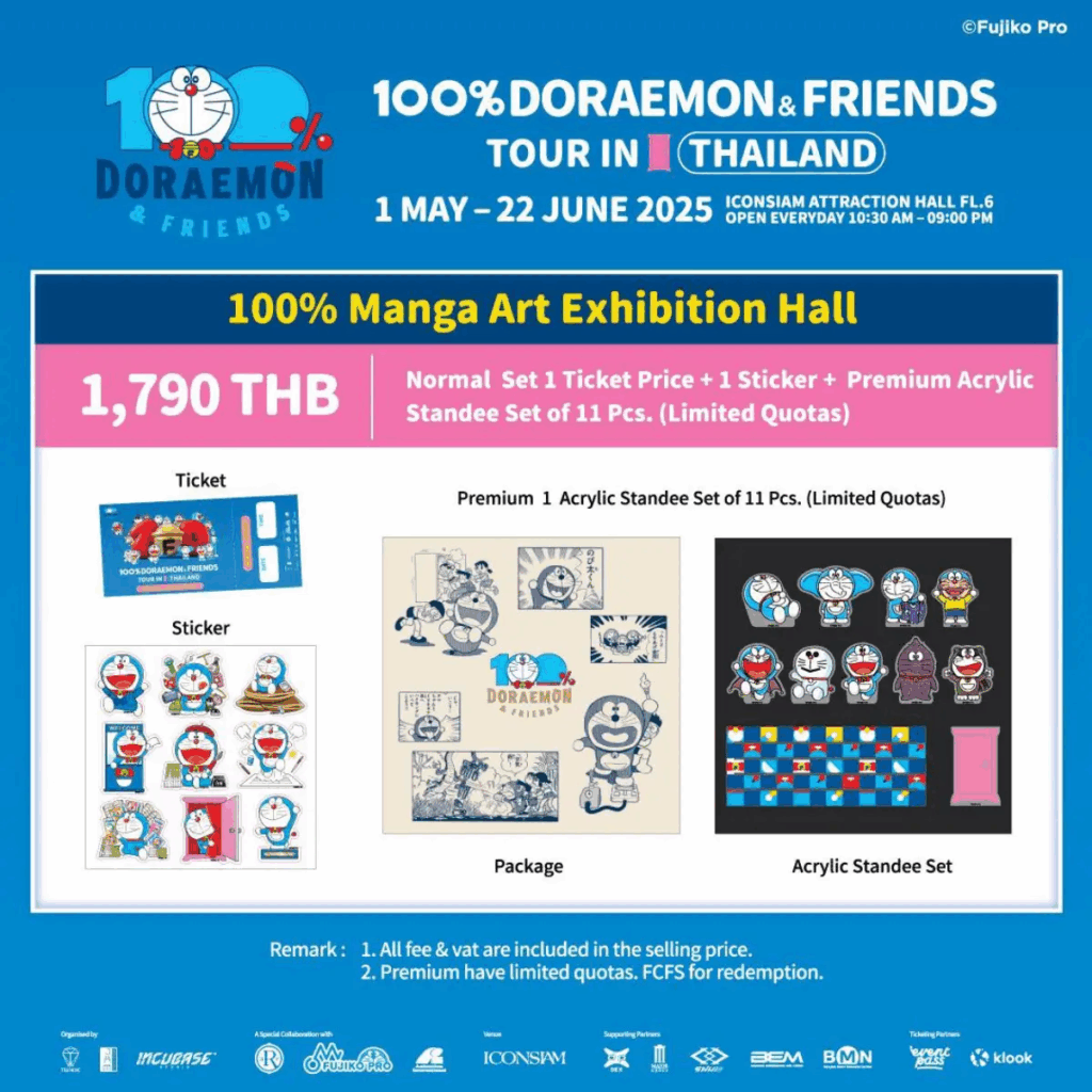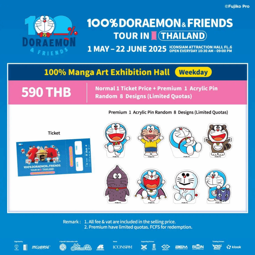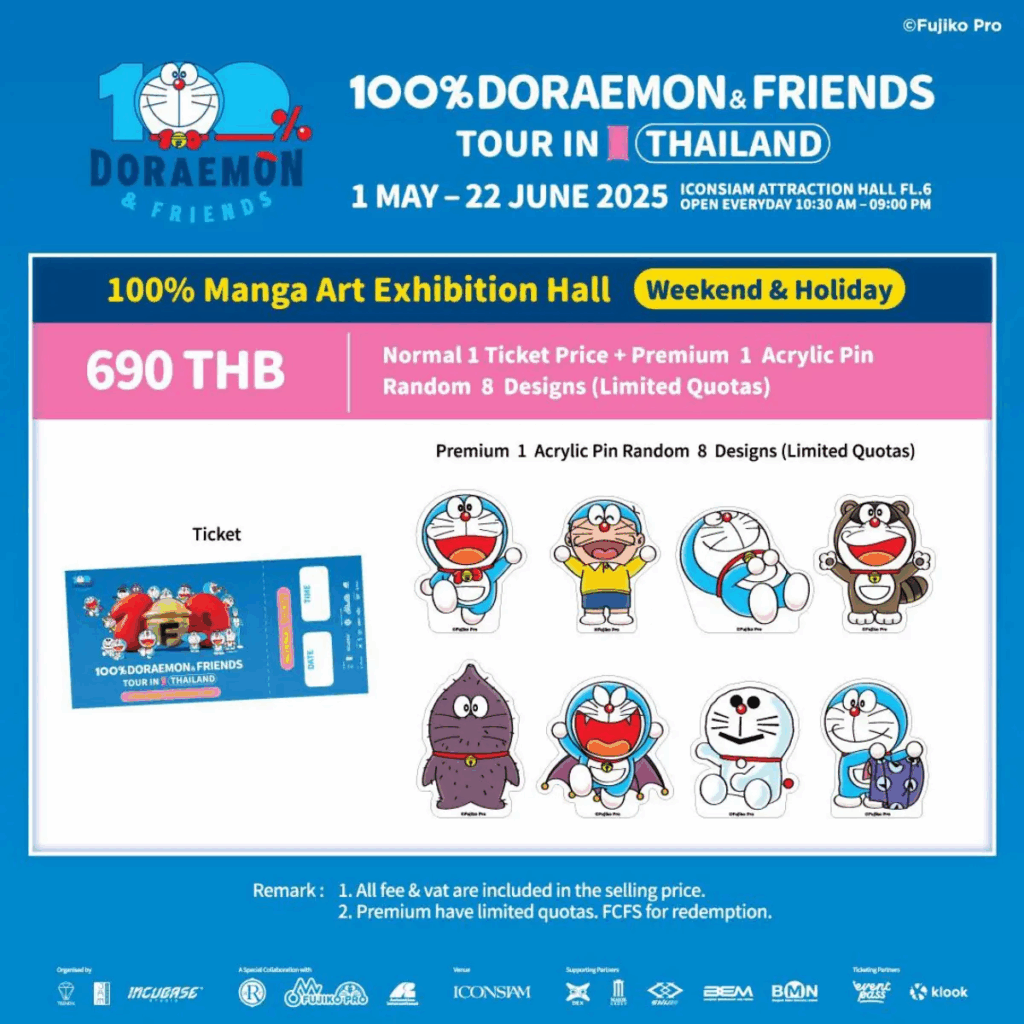 - บัตรทั่วไป วันเสาร์ – อาทิตย์ และ วันหยุดนักขัตฤกษ์ : ราคา 690 บาท ประกอบด้วย ตั๋วเข้างาน 1 ใบ + เข็มกลัดอะคริลิค “100% DORAEMON & FRIENDS” สุ่ม 1 แบบ จาก 8 แบบ