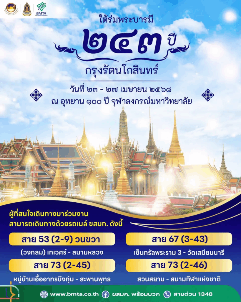 เตรียมตัวให้พร้อม แล้วไปสนุกกันในงานสุดยิ่งใหญ่ “ใต้ร่มพระบารมี 243 ปี กรุงรัตนโกสินทร์” ซึ่งจะจัดขึ้นระหว่างวันที่ 23 – 27 เมษายน 2568 ณ อุทยาน 100 ปี จุฬาลงกรณ์มหาวิทยาลัย, พิพิธภัณฑสถานแห่งชาติ พระนคร และ วัดประยุรวงศาวาสวรวิหาร ร่วมเฉลิมฉลองวาระครบ 243 ปีแห่งการสถาปนากรุงรัตนโกสินทร์ ด้วยกิจกรรมสุดพิเศษมากมาย ไม่ว่าจะเป็น นิทรรศการย้อนรอยประวัติศาสตร์ หนังกลางแปลงสุดคลาสสิก เวิร์กชอปงานฝีมือและศิลปะไทย อาหารอร่อยจากร้านเด็ดทั่วกรุง บอกเลยว่างานนี้สายวัฒนธรรม สายถ่ายรูป หรือสายกินบอกเลยว่าฟินครบทุกแนว! โดยเฉพาะใครที่ชอบเดินสยาม ต้องแวะมาเช็กอินที่เที่ยวกรุงเทพ ห้ามพลาดเด็ดขาด