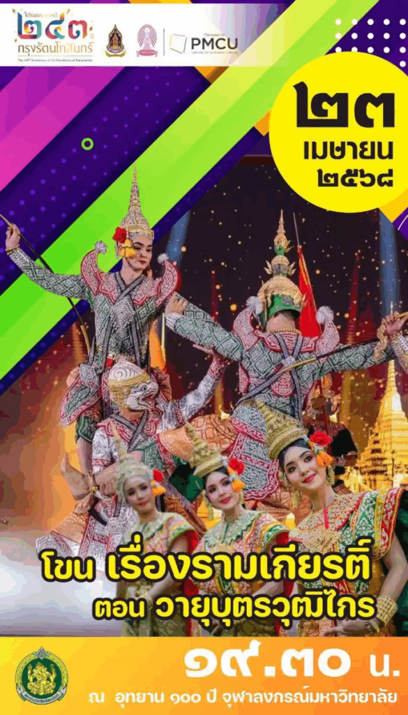- 19.30 น. : โขน เรื่องรามเกียรติ์ ตอน วายุบุตรวุฒิไกร