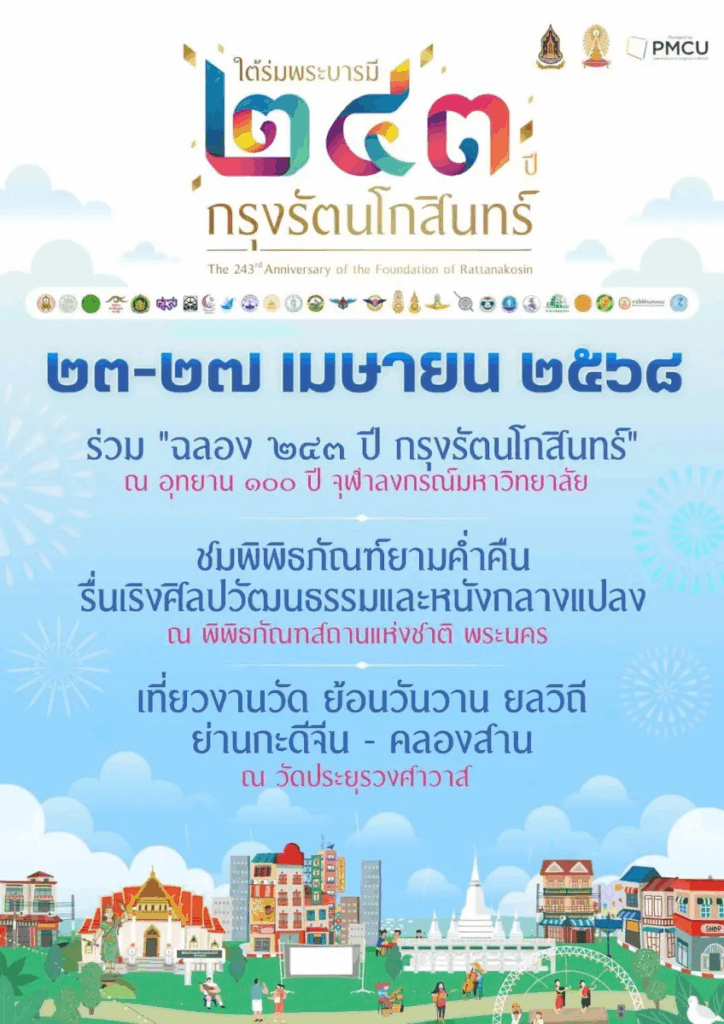 ร่วมเฉลิมฉลองในโอกาสสำคัญแห่งประวัติศาสตร์ไทย เนื่องในวาระครบรอบ 243 ปี วันสถาปนากรุงรัตนโกสินทร์ เพื่อรำลึกถึงพระมหากรุณาธิคุณอันหาที่สุดมิได้ และร่วมเทิดพระเกียรติ พระบาทสมเด็จพระพุทธยอดฟ้าจุฬาโลกมหาราช ปฐมกษัตริย์แห่งราชวงศ์จักรี ผู้ทรงสถาปนากรุงรัตนโกสินทร์เป็นราชธานี เมื่อวันที่ 21 เมษายน พุทธศักราช 2325 งานนี้ไม่เพียงแต่จะได้เรียนรู้เรื่องราวประวัติศาสตร์ผ่านกิจกรรมและนิทรรศการหลากหลาย แต่ยังเป็นโอกาสอันดีในการร่วมกันภาคภูมิใจในรากเหง้าและความเป็นไทยที่งดงามกว่า 2 ศตวรรษ